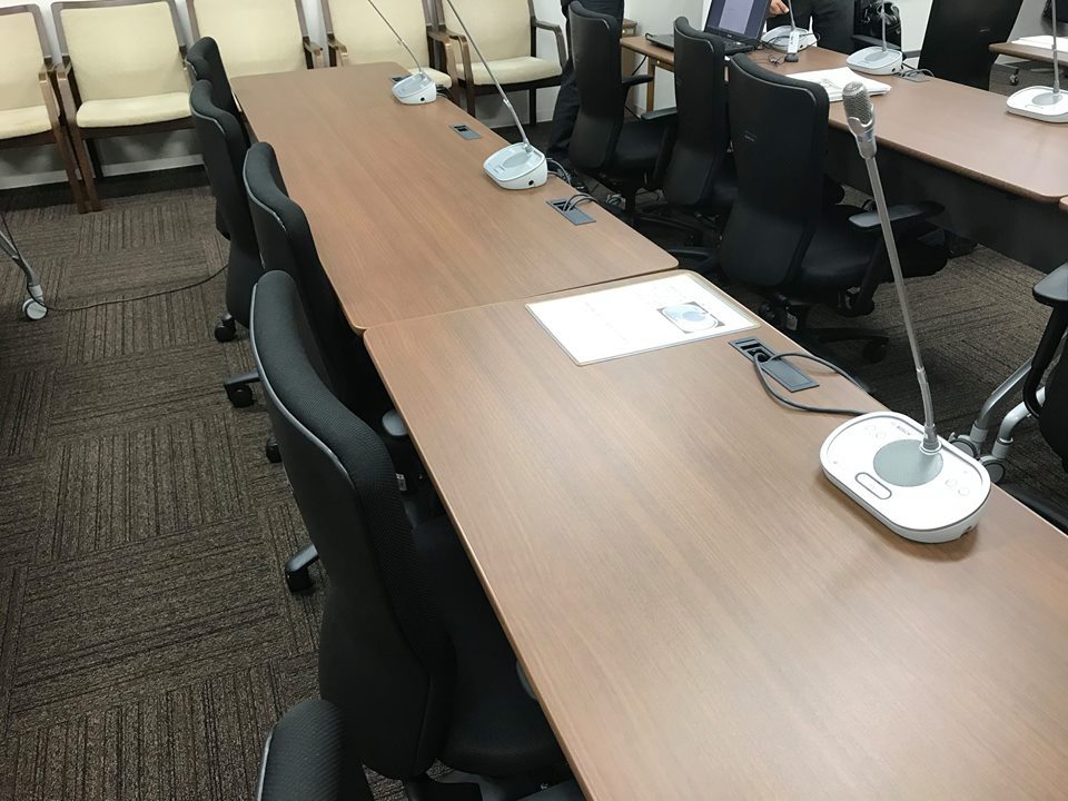 委員会室。各テーブルにマイクが設置されています。マイ
