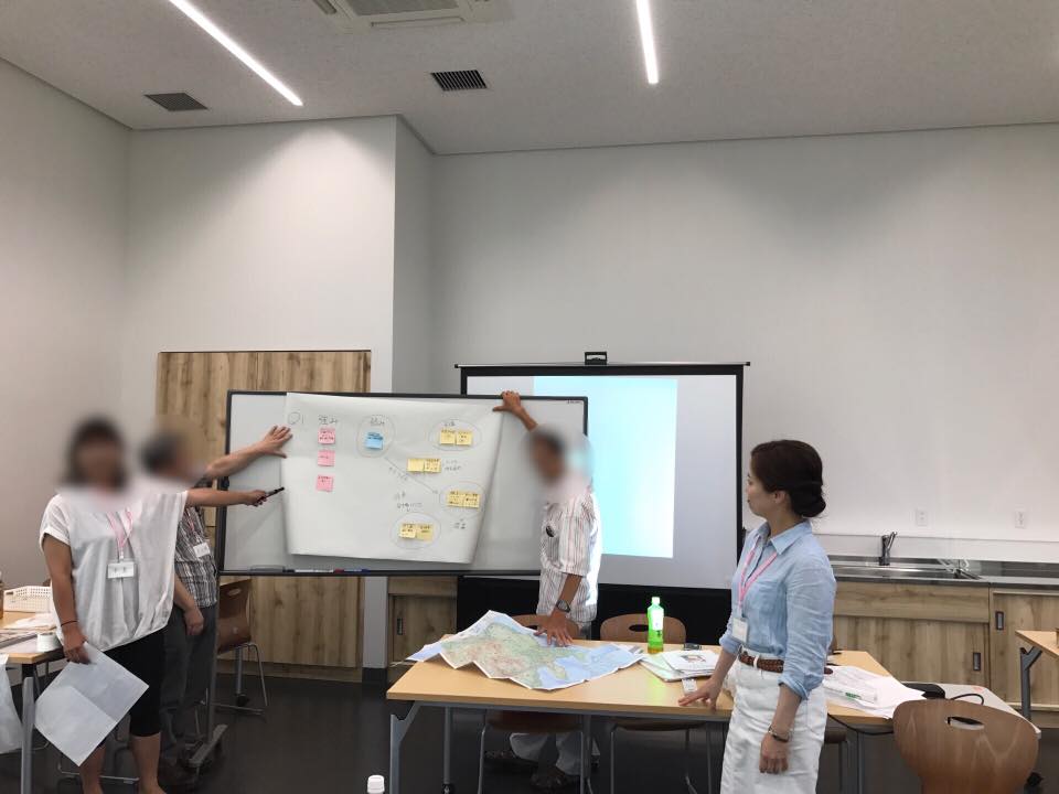 冒頭に、事前に準備した近隣自治体や23区等との比較表(人口、面積、高齢化率、予算額、1人当たりの予算額、まちづくりのキャッチコピー等)のリサーチ報告をしてから、グループに分かれてディスカッションです。