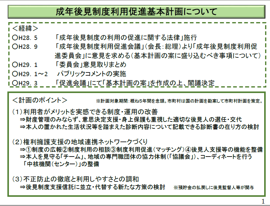 平成28年に成年後見制度利用促進法ができ、それに基づき平成29年3年に基本計画が決定されました。