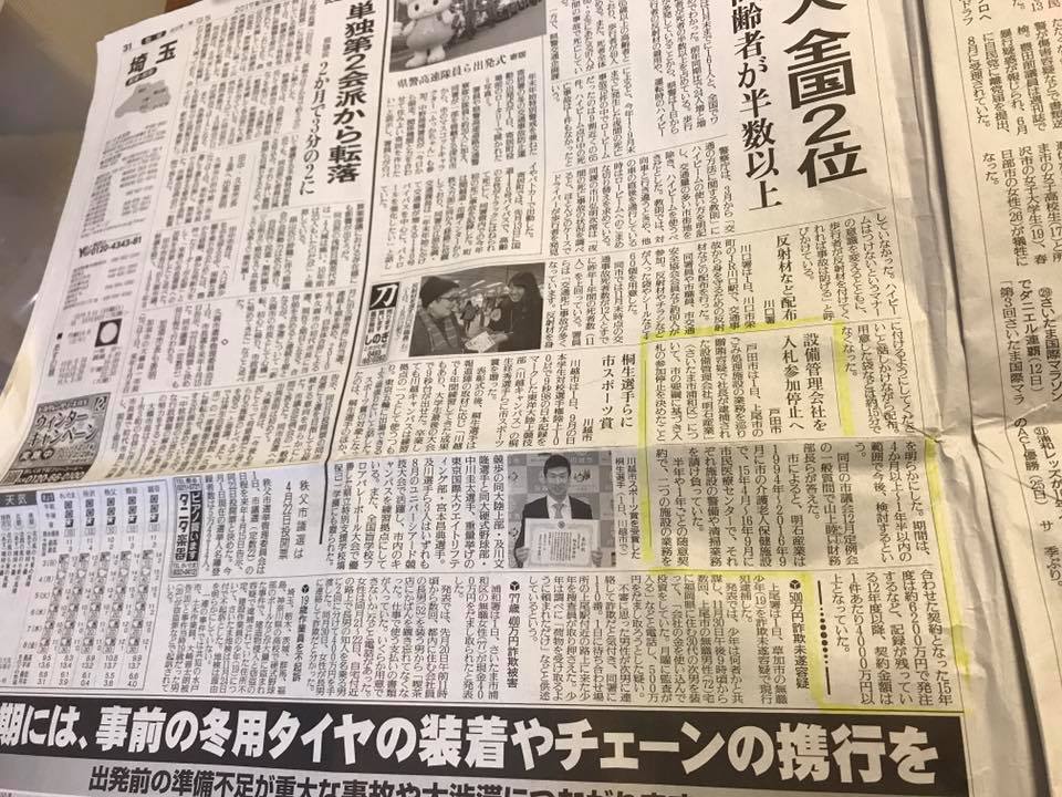 本日の読売新聞埼玉版に、昨日の私の一般質問が掲載されました。 上尾市で市長・議長が逮捕された入札にかかる贈収賄事件について、贈賄側の事業者が長年戸田市でも契約をしていたことを明らかにし、今後の対応を求めたものです。 市の要項に基づき、入札参加停止措置となりました。