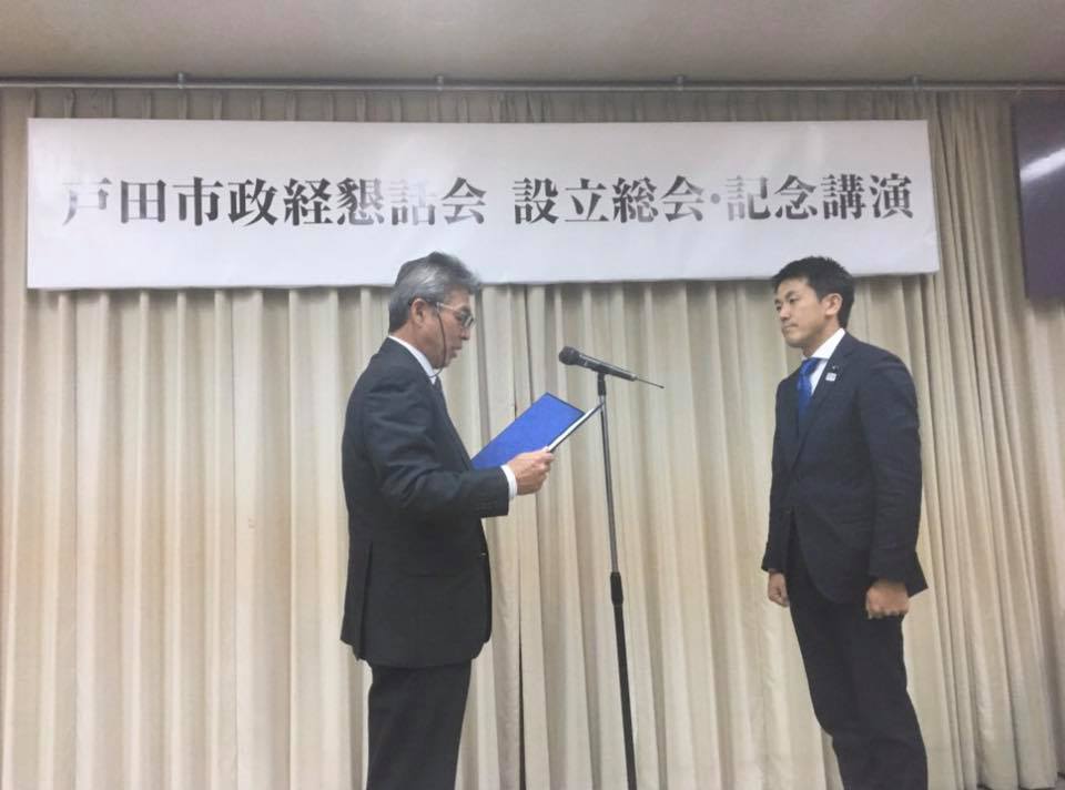 本日、ここに、戸田市政経懇話会を設立し、菅原文仁県議へ戸田市長選挙への出馬要請を決議いたしました。
