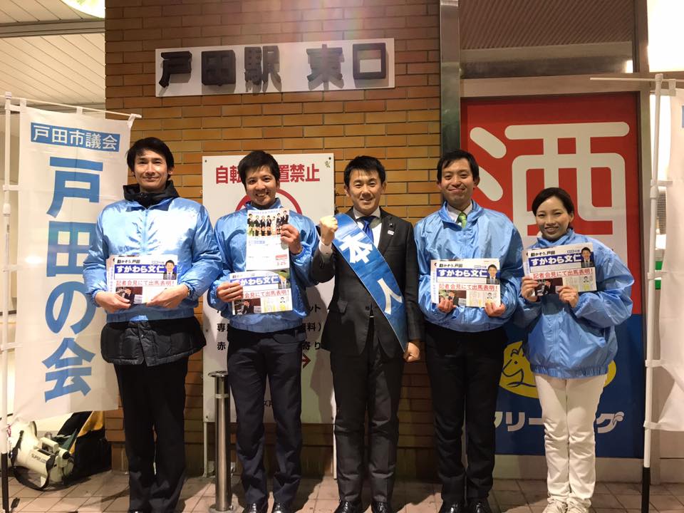夜は18時から、会派で菅原県議応援駅頭です。 当初は酒井さんもいらっしゃり、途中から菅原県議ご本人も駆け付けてくださり、戸田駅で街頭演説会を行いました。 3月に市長選挙があることをご存知ない方が想像以上に多い印象です。