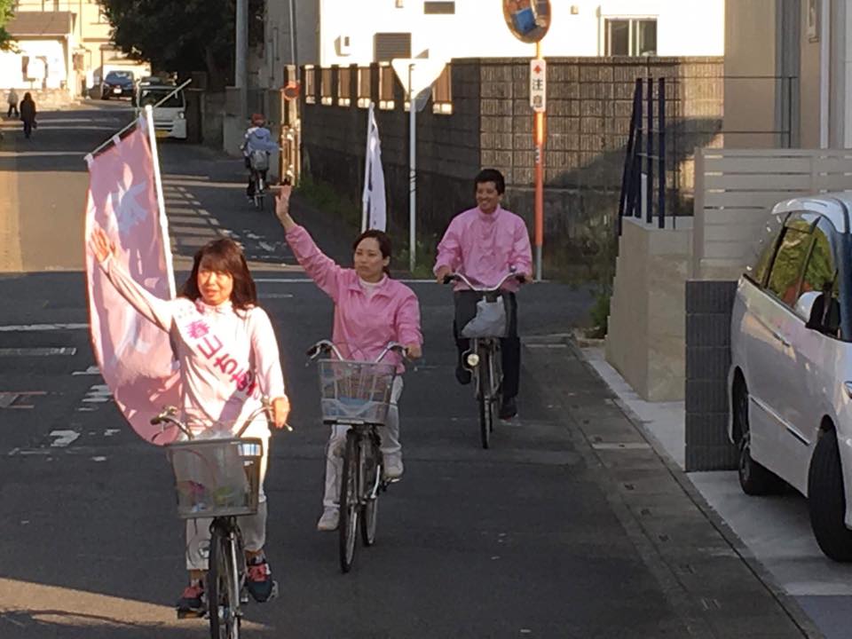 春山ちあき候補は、平成17年の補選に当選なさってから5回目の選挙です。 二人のお子さんを育てたり書道教室で教えたりしながら議員活動を続け、これまですべての議会で一般質問に立っているそうです。 男性社会の議会の中でお辛いことも多々あったと思いますが、微塵も見せずにいつもニコニコキラキラしていらして、良い香りのする方です。 大激戦の選挙戦では選挙カーではなく、自転車に乗って会う人皆さんに駆け寄って握手をなさっていました。 私が春山ちあき候補と同じ年齢だったら、きっと真似できません。
