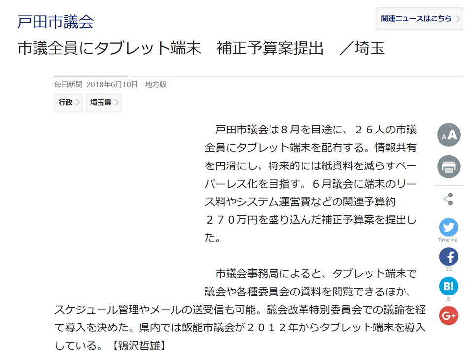 (1)①タブレット端末導入によるペーパーレス化は今回の6月議会で予算が計上され、早ければ8月には導入し、9月議会から運用が始まる予定です。市内の方に教えていただき、新聞記事になっていたそうです。