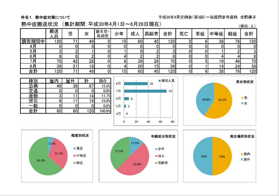 総務省消防庁の報告によると今年7月の救急搬送が54,220人、死亡者67人であり、私宛にもご意見・ご要望を多くいただき、今回まとめて一般質問にて取り上げました。