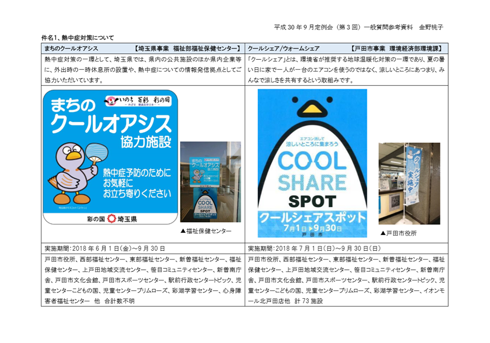 また、クールオアシスとクールシェアは、切り口が違うだけでやっている事はほぼ同じ事業です(クールオアシスは熱中症対策を目的とした県の事業、クールシェアは温暖化対策を目的とした市の事業)。縦割り行政と言えばそれまでですが、良い事業だとおもっていますので、今後事業の精査・見直しと周知徹底が必要だと感じました。