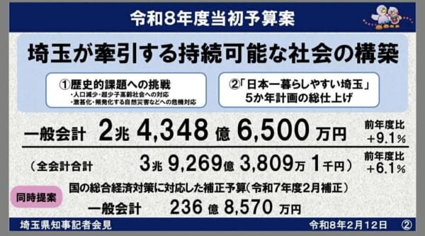 ◆第1号議案 令和8年度埼玉県一般会計予算 2兆 4,348億 6,500万円(前年度比 +9.1%)