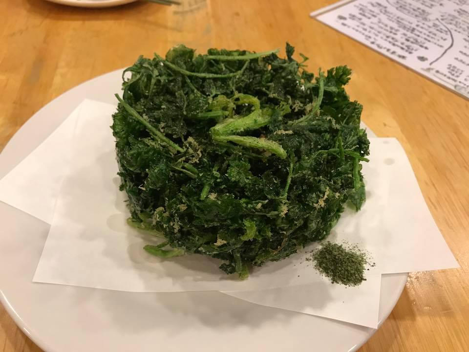 パク天です。パクチーのかき揚げに、パク塩をかけていただきます。