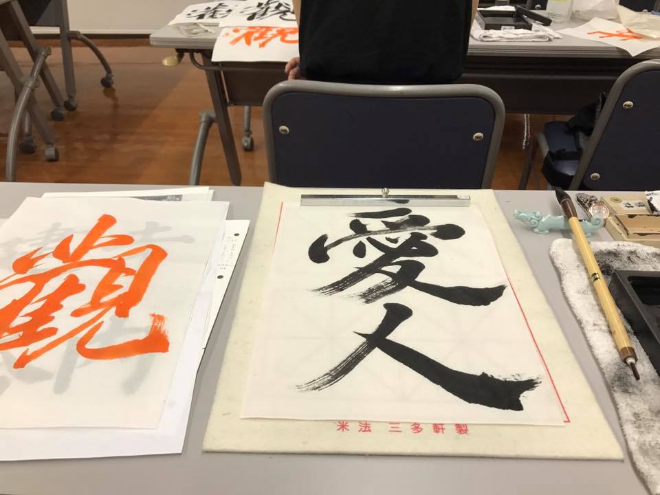顔真卿をこよなく愛した一人が西郷隆盛だそうで、その西郷隆盛の言葉「敬天愛人」(天を敬い、人を愛する」を先生のお手本を見ながら書いてみました。 先生には「愛人が上手だね」と褒めていただき、特別に「桃子」の落款を入れていただきました。 クラスのみんなと一緒に笑いました。