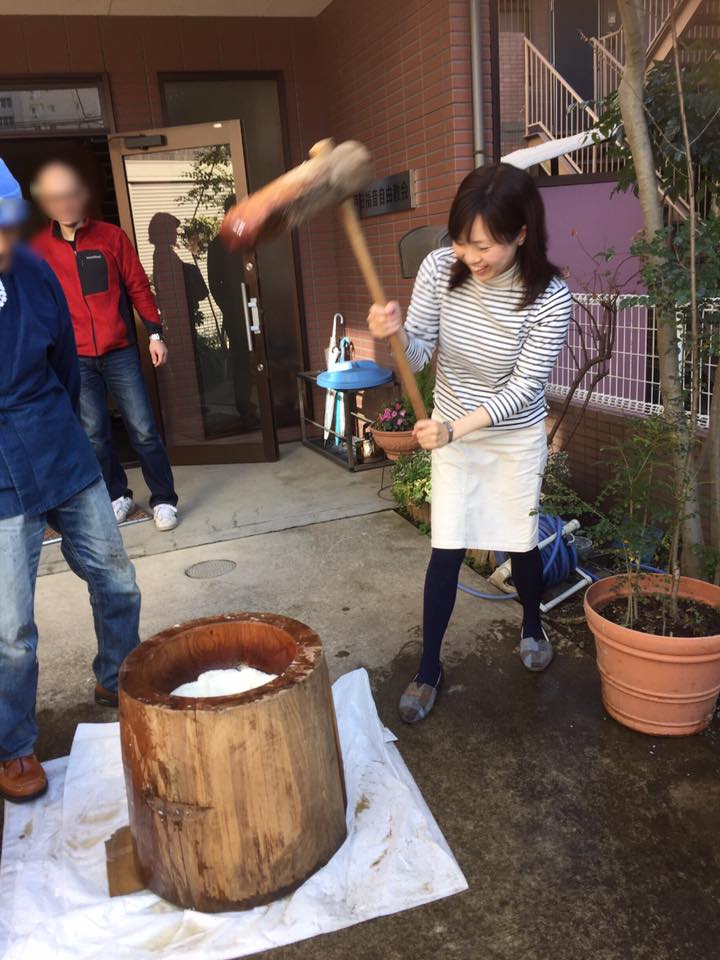 私もご厚意で、お餅をつかせていただきましたが、意外に杵が重たくて完全にへっぴり腰です。