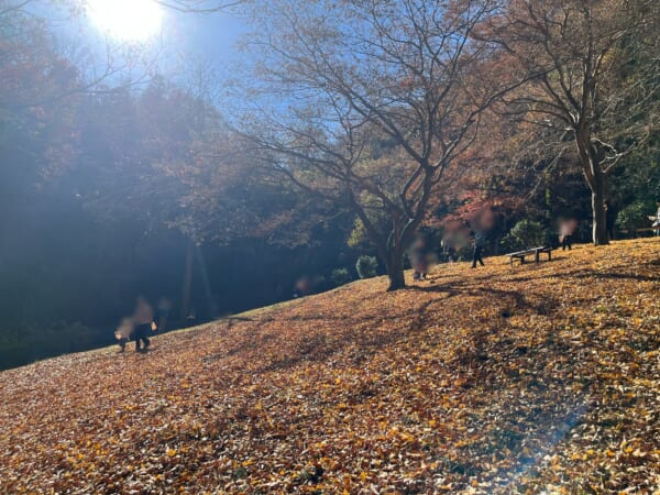 焚き火の周りで自分たちで作ったホットサンドと焼き芋を食べた後は、メインイベントの落ち葉遊びです。