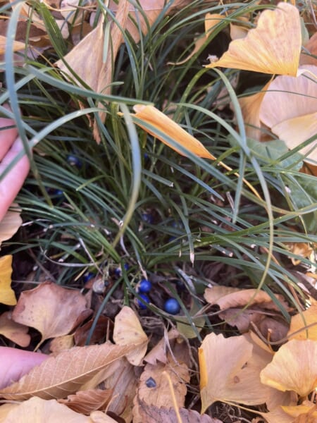 職員の方から、銀杏の落ち葉の中にある緑の葉っぱの中に、青いきれいな実があり、「龍の目」と教えていただき、子どもたちも夢中になって探しました。