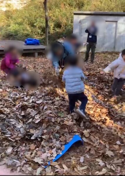 たっぷりの落ち葉を集めて思う存分遊びます。