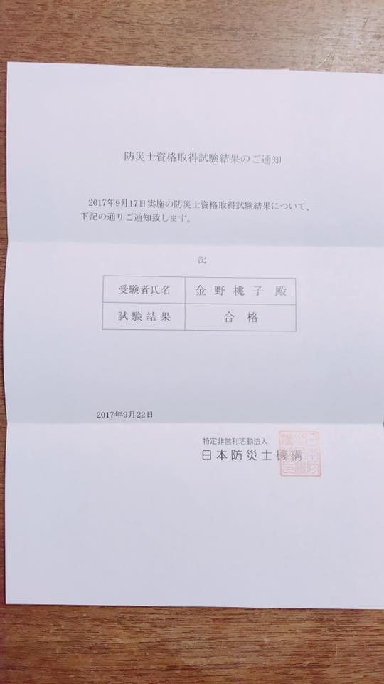 本日、自宅に防災士資格取得試験結果が届き、無事合格できました! 救命講習、事前課題、二日間の講習会と頑張ってよかったです。 民間の資格ではありますが、しっかり防災対策に取り組んでいきたいと思います。