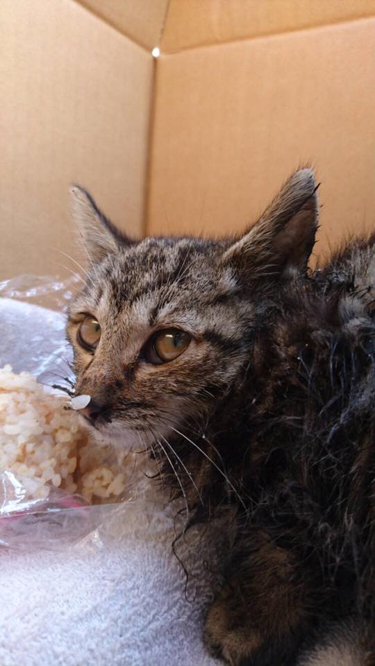 おなかが空きすぎて、かつお節ごはんにがっついていた子猫が、ここまでふわふわになり、優しい里親さんに抱っこされて、今では床暖房の上で元気に遊んでいるようです。