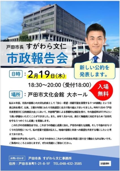 市政報告会では、市長としてのこれまでの取組みと、今後のまちづくりの方向性について、新しい公約の発表も含めてご報告させて頂きます。