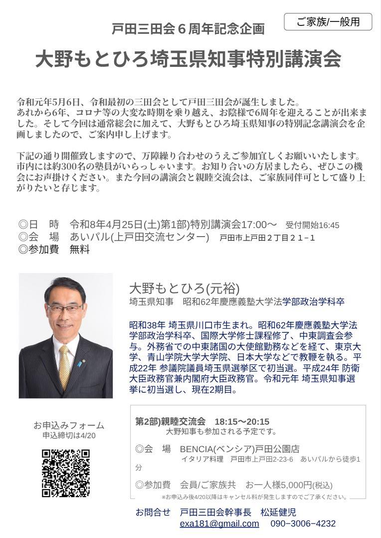 〈お知らせ〉戸田三田会6周年記念企画ー大野もとひろ埼玉県知事特別講演会