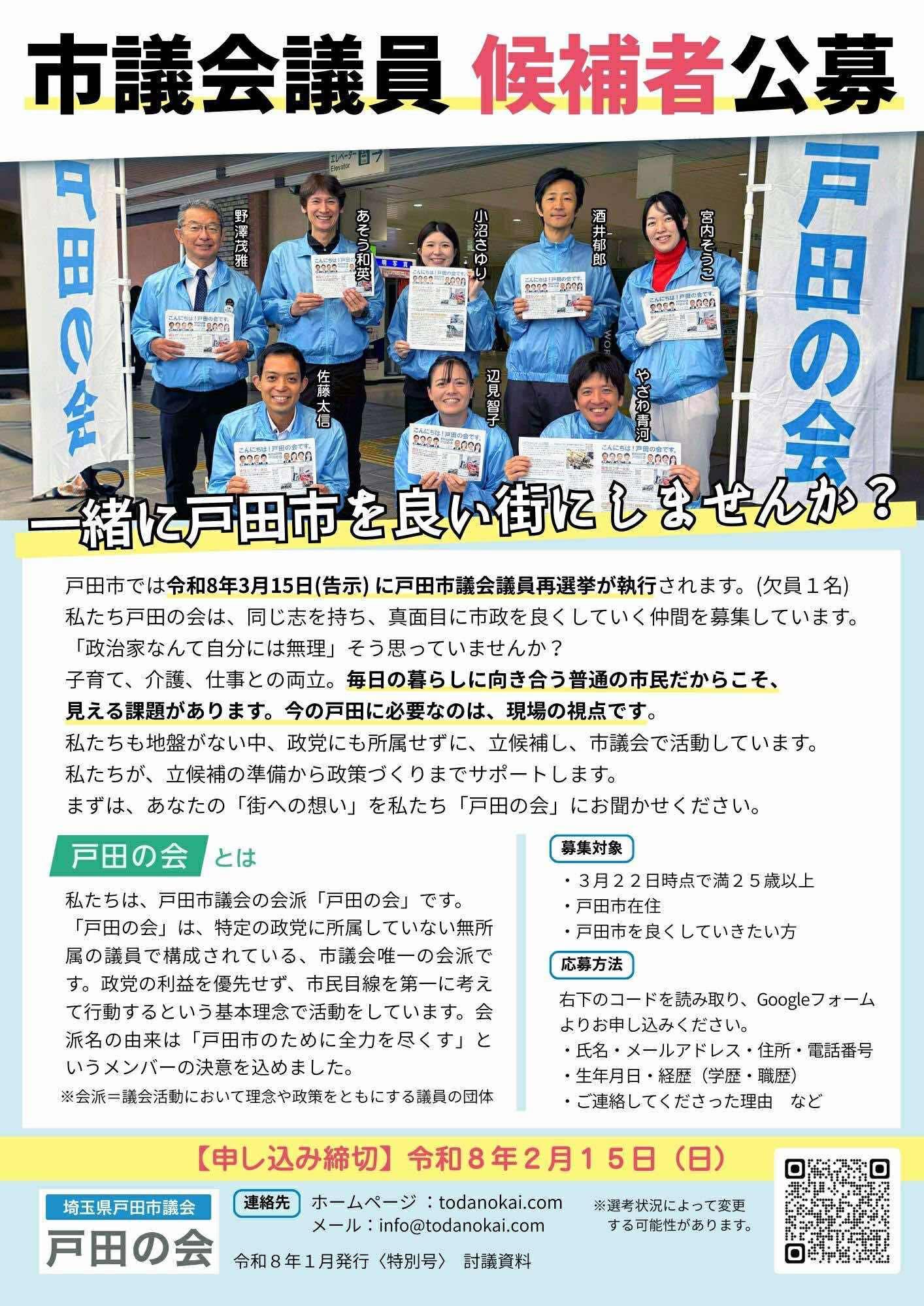 3月15日告示で戸田市議会議員総選挙が施行されます(欠員1名) 。戸田の会では、同じ志を持ち、真面目に市政を良くしていく仲間を募集しています。「政治家なんて自分には無理」と思っている方にも、戸田の会がサポートします。もち