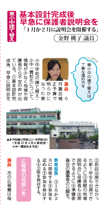 前期最後の議会で取り上げていた戸田東小中学校の建て替えについての地域・保護者説明会が開かれます。