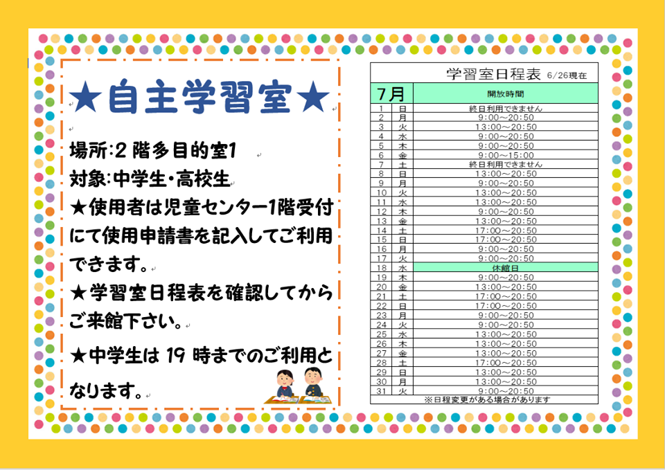 現在も不定期ながら2階多目的室を自習室として開放しています。