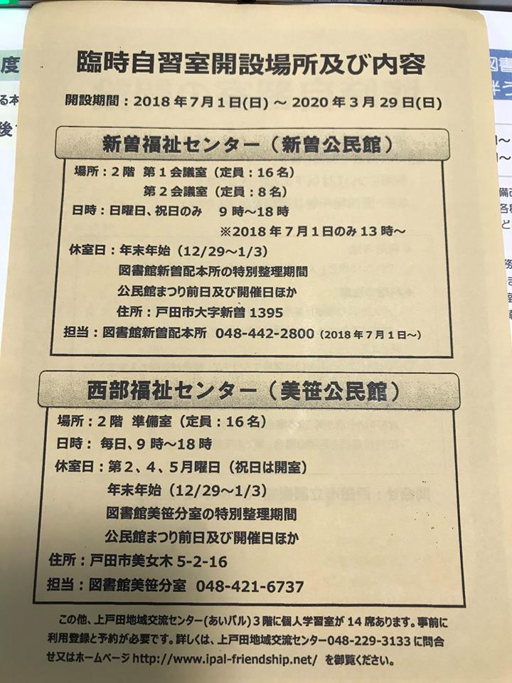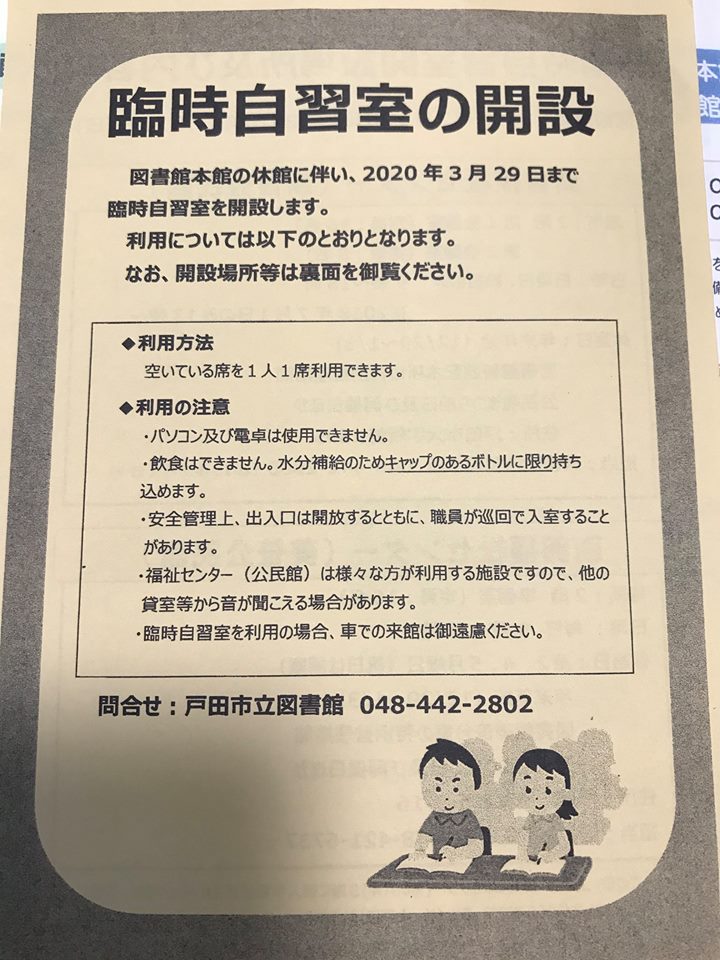 長期閉館に伴い自習室確保を議会でも度々取り上げており、いくつかスペースを開放してくださったので、改めてお知らせいたします。